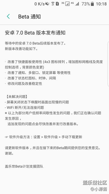 - 11月29日下午2時(shí),三星S7、S7 edge迎來了7.0內(nèi)測的第二版系統(tǒng),除了原來的乘客有機(jī)會(huì)升級(jí),還增加了9000個(gè)車位,這次真的誠意滿滿啊,然而那天刷蓋樂世空間還是一樣的崩潰(據(jù)某些新乘客),不管怎么說,這次升級(jí)更新的雖然不多,卻很實(shí)用,很貼心。 首先來看看這版本更新了什么,不知為何升級(jí)那里沒有說,只好去看空間里的beta通知,從圖所知,其實(shí)更新的并不多,最主要還是bug的改善,還有比較重要的就是下拉欄的變化狀態(tài)欄的圖標(biāo)也改得不一樣了噢~ 還是來看看下拉欄,終于可以選擇5*3的布局了,比之前3*3好看不少。咦,怎么亮度調(diào)節(jié)還沒在一次下拉中(打滾ing...)原來,在下