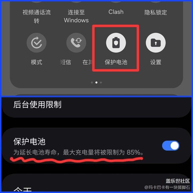 - 相信小伙伴們在平時使用手機(jī)的過程中都或多或少擔(dān)心過電池的健康,那么有沒有一種方法可以適當(dāng)?shù)臏p輕我們心中的擔(dān)憂,亦或是確確實(shí)實(shí)的幫助我們保護(hù)電池呢?今天我就來提供一種思路雖然系統(tǒng)自帶的保護(hù)電池,可以幫助我們每次充電最多只充到85但有的時候我們還是希望能充滿,多用幾小時如果每次都手動切換真的很麻煩那么就要有請日常程序出馬了首先當(dāng)電池電量低于30%充電時,關(guān)閉保護(hù)電池,使得我們可以一口氣沖到百分之百當(dāng)電池充滿時,自動開啟保護(hù)電池,保護(hù)電池容量不超過85%,直到下一次電量低于30%下面是我的日常程序詳細(xì)設(shè)置,還請大家借鑒:這么做的原因很簡單,平時我們并不需要充的很滿,而當(dāng)電量只剩不到30時,說明我們需