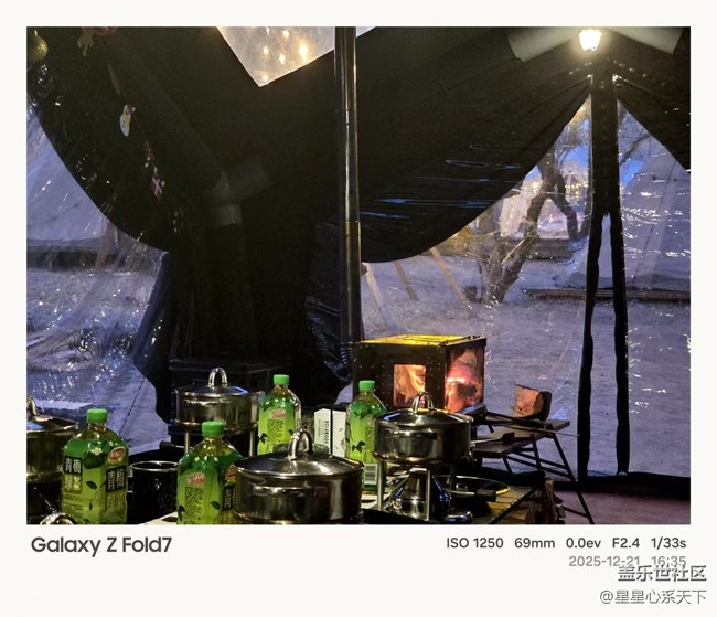 - 有幸參加沈陽社區(qū)舉辦的fold7和z filp7冬日攝影 Fold7的攝像體驗(yàn)展現(xiàn)了卓越的影像性能,其先進(jìn)的硬件配置與優(yōu)化的軟件算法相結(jié)合,能夠捕捉清晰細(xì)膩的畫面。 無論是在弱光環(huán)境還是動(dòng)態(tài)場景下,F(xiàn)old7都能保持出色的色彩還原與細(xì)節(jié)表現(xiàn)。多焦段鏡頭系統(tǒng)提供了靈活的創(chuàng)作空間,滿足專業(yè)攝影需求。智能防抖技術(shù)有效減少畫面抖動(dòng),確保視頻拍攝的穩(wěn)定性。整體而言,F(xiàn)old7的攝像功能在便攜性與專業(yè)性之間實(shí)現(xiàn)了平衡。這里的露營環(huán)境還是不錯(cuò)的折疊屏在冬天的環(huán)境,還是很耐用的這時(shí)候一只橘貓進(jìn)來了雖然天氣有點(diǎn)冷,但是咱們爐火旺外面的天空逐漸暗了下來吃的小火鍋也準(zhǔn)備就緒冬至得吃餃子啊fold7進(jìn)行講