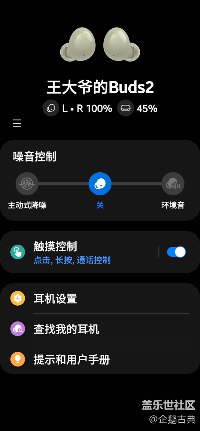 - 我的buds2,去年11節(jié) 三星商場(chǎng)購(gòu)買。一直陪在身邊,幾乎天天使用。幾乎滿足了我對(duì)藍(lán)牙耳機(jī)的一切需求。電話,游戲,不在干擾到別人了。每天的通勤,噪音也無(wú)法干擾到我了。真的很爽。buds2值得一說(shuō)的是,佩戴感。無(wú)與倫比的佩戴感。耳朵幾乎感覺(jué)不到太多的異物感。這對(duì)長(zhǎng)期使用非常重要。而且音質(zhì)也不錯(cuò)。上個(gè)月更新居然還支持360音頻了。太給力了。陪伴我[溫暖前行]的必須是我的buds2。謝謝三星設(shè)計(jì)這么好的產(chǎn)品。專門為buds2配了新的耳套給buds2整了一個(gè)套子偽裝一下