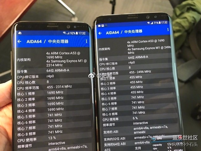 - 隨著Galaxy S8/S8+的發(fā)布,發(fā)掘各項(xiàng)詳細(xì)的參數(shù)成了網(wǎng)友們近幾天經(jīng)常干的事情。就在剛剛,愛搞機(jī)主編@肥威在微博上透露,國際版單卡Galaxy S8以及Galaxy S8+搭載的Exynos 8895處理器并不完全相同。具體來說,Galaxy S8的Exynos 8895處理器大核心主頻2.3GHz,而Galaxy S8+的則達(dá)到了2.5GHz,性能會(huì)有一定差距。從跑分來看,Galaxy S8的RAR單線程成績?yōu)?10分,Galaxy S8+的單線程則是630分。另外,需要說明的是,二者的GPU頻率相同,均為546MHz。如此一來,買Galaxy S8+就多了一個(gè)理由,不僅電池容量更大,