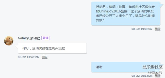 - 在社區(qū)里七月二十一日參加的同城活動【搶票!蓋樂世社區(qū)邀你參加ChinaJoy2016盛宴!】里面的第三個活動:3、現(xiàn)場拍照會后分享名單正在統(tǒng)計,近期會公布,請大家耐心等待這個活動的統(tǒng)計結(jié)果現(xiàn)在也沒有出來,還有前兩個的獎品發(fā)放情況現(xiàn)在是什么情況了???我在八月十九日詢問了活動發(fā)起者:Galaxy_活動君現(xiàn)在從活動發(fā)起到現(xiàn)在一個月都過去了請問現(xiàn)在什么情況了?已收貨,下午曬下。