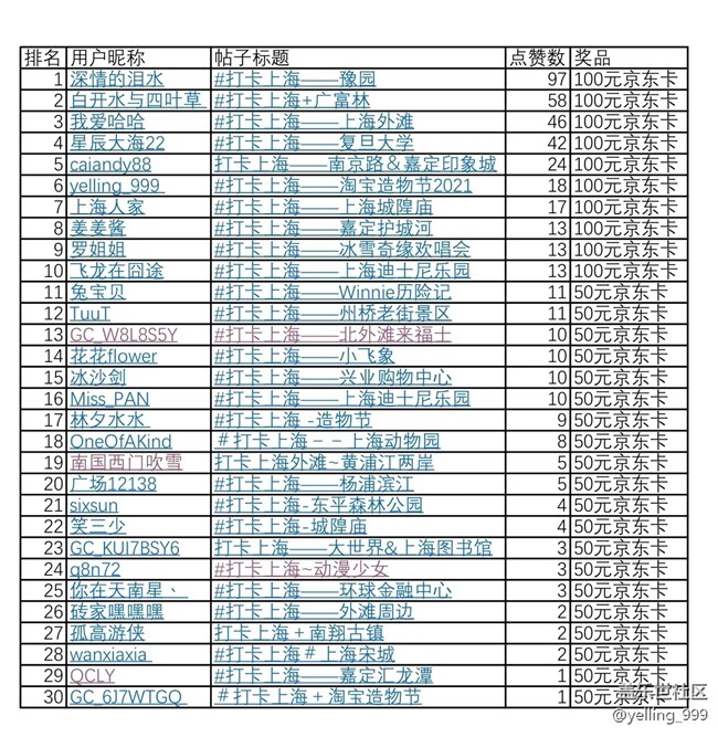 - 為期11天的上海星部落8月攝影活動(dòng)已落下帷幕。感謝小伙伴們的熱情參與。此次,共有30位小伙伴發(fā)布了#打卡上海#為主題的攝影作品。作品內(nèi)容涵蓋了大部分上海的熱門景點(diǎn),如上海迪士尼樂園、外灘、豫園、廣富林、東平森林公園、南京路、復(fù)旦大學(xué)、動(dòng)物園、城隍廟、大世界、環(huán)球金融中心、楊浦濱江、來福士、圖書館、宋城、老街等。更有淘寶造物節(jié)、三星線下門店攝影等等活動(dòng)的記錄。攝影作品形式多樣,不乏很多優(yōu)秀作品的參與。按照活動(dòng)規(guī)則,按照點(diǎn)贊數(shù)(點(diǎn)贊數(shù)相同,以發(fā)帖時(shí)間先為依據(jù))排名,獲獎(jiǎng)名單如下: