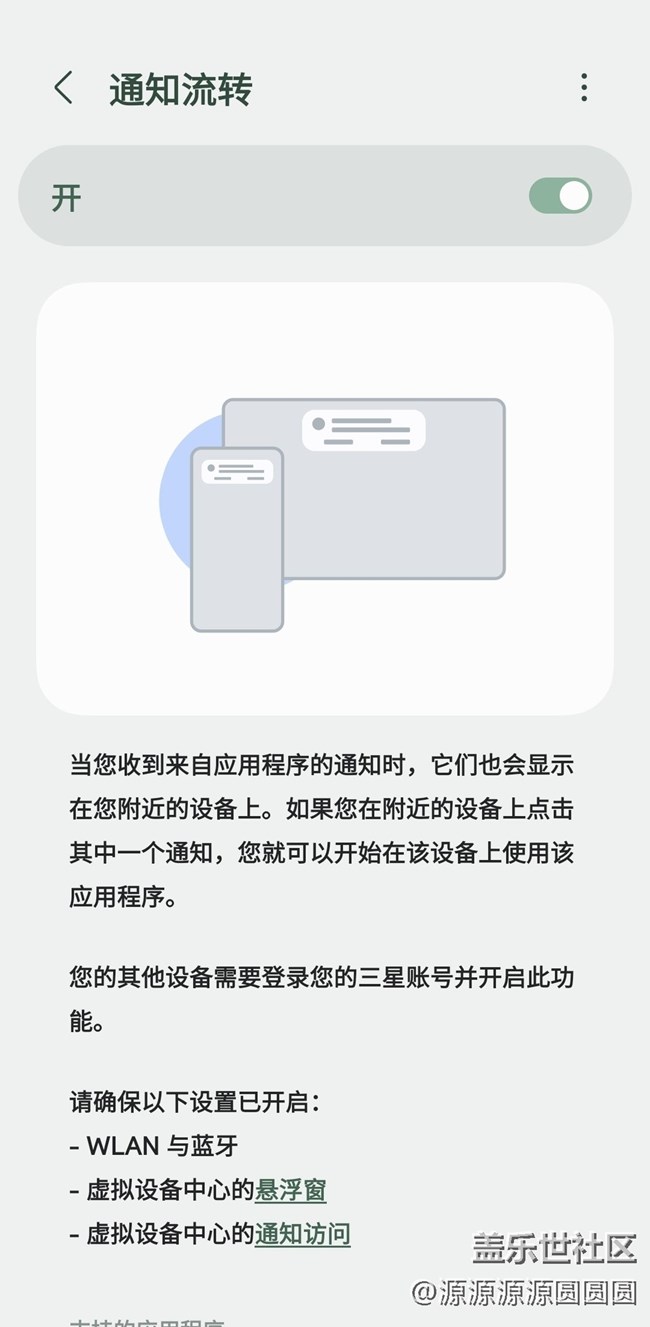 - 在使用平板時,常常會因為手機放置在旁邊而錯過重要消息,或者不便于頻繁拿起手機查看。在國行One UI7上,三星推出的通知流轉功能,正好解決了這一痛點,讓多設備體驗更連貫。一、開啟方法前置條件1、首先要確保你的三星手機、平板均為國行One UI7系統(tǒng)2、虛擬設備中心APP為商店最新版本3、兩者需登錄同一個三星賬號4、兩者WLAN、藍牙均處于開啟狀態(tài)5、手機端需要開啟虛擬設備中心的懸浮窗、通知訪問權限開啟方式Tab端/手機端:設置 > 已連接設備 > 通知流轉,并啟用功能二、使用體驗當手機端收到消息時,平板端會同步彈出通知,通知中提供忽略或流轉到此設備兩個選項選擇流轉到此設備后,手機和