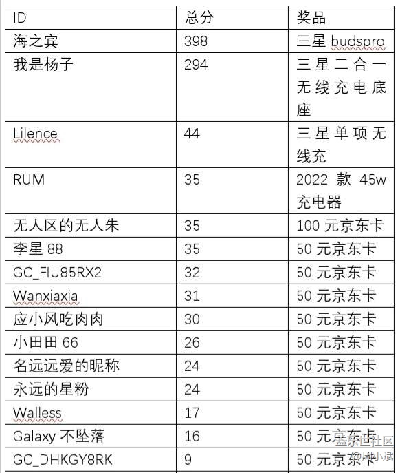 - 參賽作品去掉無效評(píng)論名次如下:注:若分?jǐn)?shù)相同按發(fā)帖順序排名以上結(jié)果如有異議,請(qǐng)于2022年10月28日18:00前私信酋長(zhǎng),超出時(shí)間視為無異議。 我會(huì)私信獲獎(jiǎng)用戶,實(shí)體獎(jiǎng)品包郵。獲實(shí)體獎(jiǎng)品用戶提供姓名,電話,收貨地址,身份證正反面照片,社區(qū)ID號(hào)進(jìn)行登記。獲得京東卡的用戶需要提供姓名,電話,社區(qū)ID號(hào)進(jìn)行登記獎(jiǎng)項(xiàng)采購(gòu)需要審批及確認(rèn),發(fā)獎(jiǎng)時(shí)間為活動(dòng)結(jié)束后15-30個(gè)工作日,獲獎(jiǎng)伙伴還請(qǐng)耐心等待。獎(jiǎng)項(xiàng)登記信息后還需采購(gòu)需要審批及確認(rèn)I?。。榱吮U汐@獎(jiǎng)?wù)吣茉琰c(diǎn)拿到獎(jiǎng)品,獲獎(jiǎng)登記截止到11月4號(hào)并包含11月4號(hào),到期未登記則視為自動(dòng)放棄!??!
