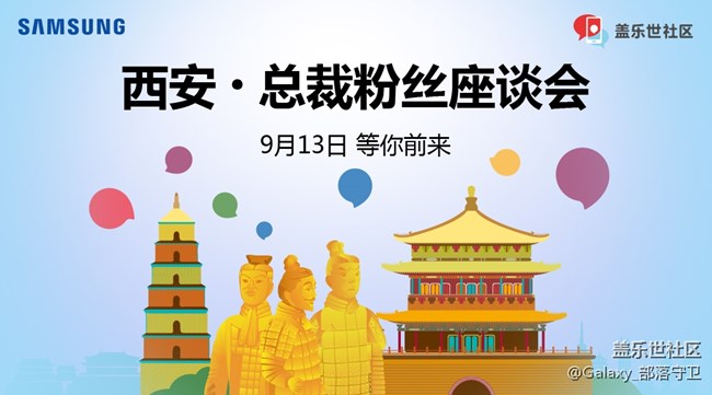 - 小伙伴們,在這秋高氣爽的日子。三星電子移動(dòng)事業(yè)部總裁——高東真先生即將到訪西安! 不知道西安的小伙伴們有沒(méi)有感到驚喜!2018年9月13日 古都西安粉絲們將有機(jī)會(huì)與高東真先生 進(jìn)行一場(chǎng)零距離的精彩座談會(huì)。小伙伴們趕快動(dòng)動(dòng)手指踴躍報(bào)名吧,名額有限,我們等你來(lái)!【招募時(shí)間】即日起-2018年9月7日【時(shí)間地點(diǎn)】9月13日 (周四) 下午活動(dòng)地點(diǎn)及到場(chǎng)時(shí)間 報(bào)名成功后短信通知 【招募對(duì)象及名額】全國(guó)星部落 粉絲100人【報(bào)名費(fèi)用】完全免費(fèi)【活動(dòng)內(nèi)容】現(xiàn)場(chǎng)的蓋樂(lè)世社區(qū)粉絲與三星高社長(zhǎng)進(jìn)行互動(dòng),零距離面對(duì)面交流討論!【報(bào)名方式】請(qǐng)按照下方報(bào)名格式填寫(xiě)內(nèi)容【特殊禮品】凡報(bào)名成功的用戶(hù),活動(dòng)結(jié)束后即可領(lǐng)取價(jià)