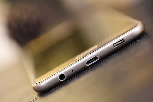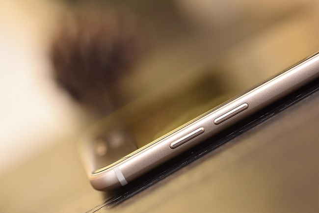 前置800萬(wàn)的攝像頭、聽(tīng)筒和光線傳感器。聽(tīng)筒的金屬感很強(qiáng)烈,同樣也是金色的,和周?chē)慕鹕澳樔跒橐惑w。