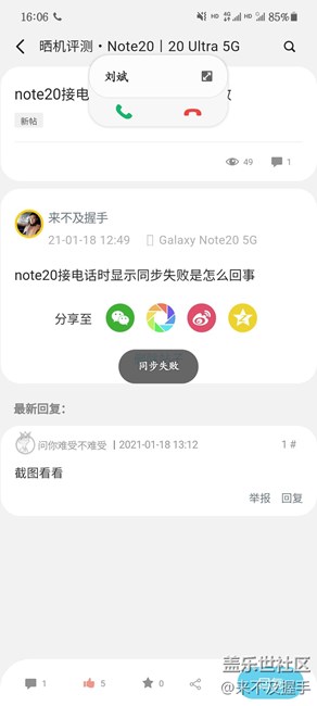 note20接電話時中間顯示同步失敗
