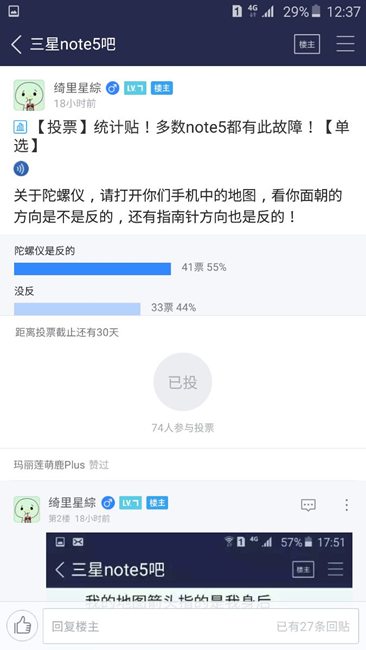 Note5 指南針嚴(yán)重不準(zhǔn),蘋果6s和note5 同時打開地圖,note 5一直都是亂指,6s正確,有圖片,兩臺手機(jī)同時指向南面,note5 是反的,按照網(wǎng)友說法是沒校準(zhǔn),拿起手機(jī)在空中畫8字,還是指向不對。在百度貼吧發(fā)起投票發(fā)現(xiàn)大多數(shù)都存在如此問題,是軟件問題還是硬件故障?希望能夠修復(fù)。