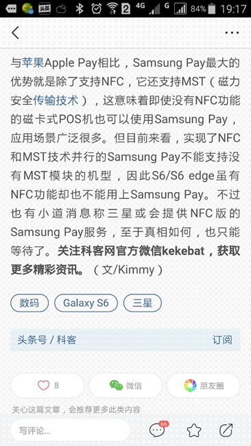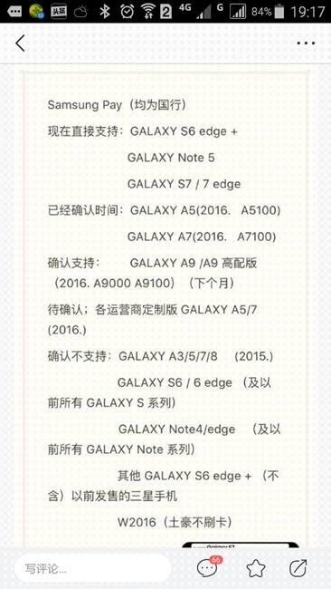 三星的說法是不支持mst功能,其實可以用NFC功能。