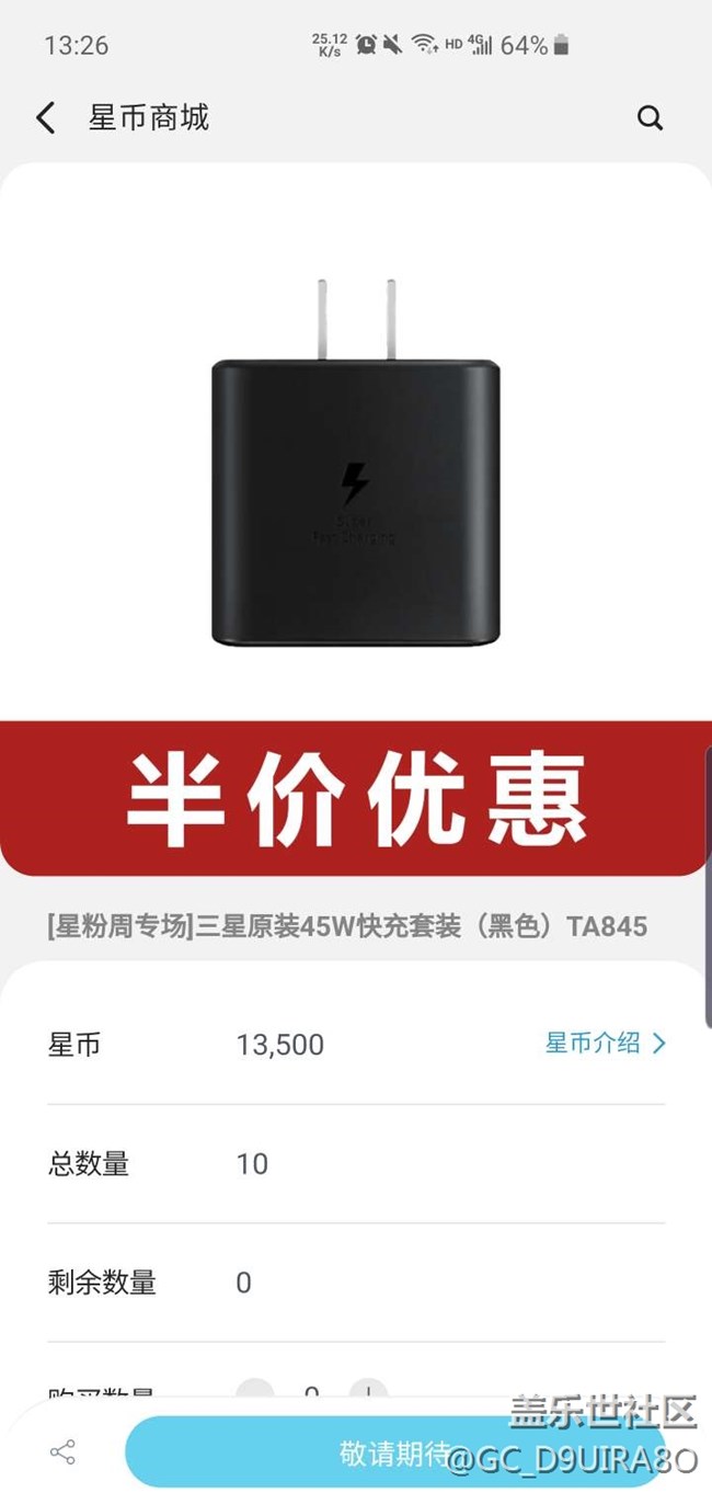 帖子名稱: 今天星幣商城上架的45w充電器有人搶到了嗎?