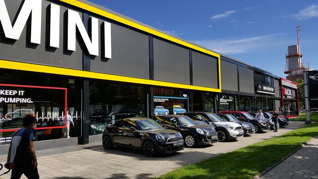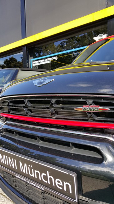 Mini的4S店,門口停放著各種版本的Mini。看,這時(shí)一輛Mini車主都想擁有一輛的JCW版(John Cooper Works)。