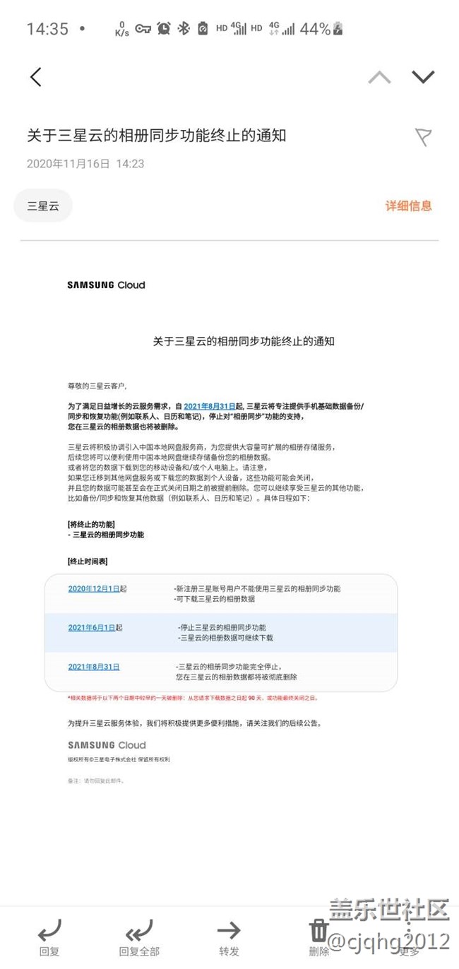 剛剛收到三星的郵件,云相冊服務將會終止。