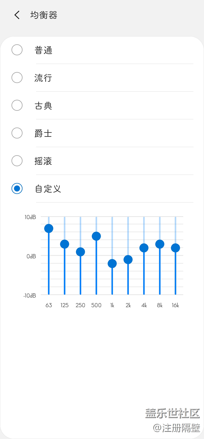 三星的均衡器真是奇葩,最基本的10段都沒有,硬是搞成9段,低音段31、62、直接融合單段63……而均衡器那些預(yù)設(shè)揚(yáng)聲器低音效果又出不來……目前自己調(diào)了個(gè),低音效果一般,有沒有大佬教一下怎么調(diào)出低音?