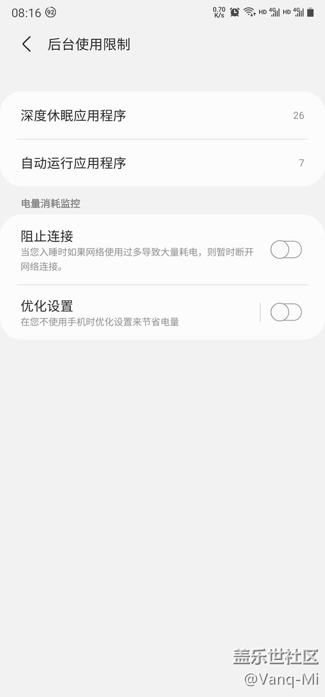 升級之前,個人使用習(xí)慣還是高刷,放棄了2K,原因是60hz刷新率肉眼可見卡頓,日常使用都是開了各種電池,如圖阻止連接優(yōu)化設(shè)置,自適應(yīng)電池,月初升級3.0后,也是打開了這些設(shè)置選項,每天早上開車到公司大概50分鐘車程,滿電出門到公司耗電在5%到7%之間,但從前兩天開始因為后臺緩存電視劇老是自動停止,就關(guān)閉圖中兩個選項,驚奇的發(fā)現(xiàn)省電一些了,特別是鎖屏待機(jī),早上藍(lán)牙聽歌,到公司只耗電3%左右,反而這些系統(tǒng)優(yōu)化選項關(guān)了還更好