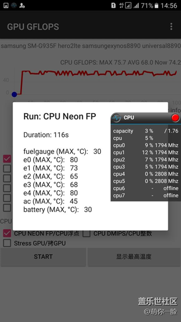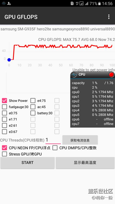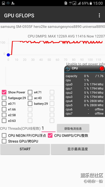 S7 edge Exynos8890超頻烤機(jī) ,Jesse的第三方內(nèi)核功耗情況炮神軟件無法顯示,但溫度我已截圖,在下面。