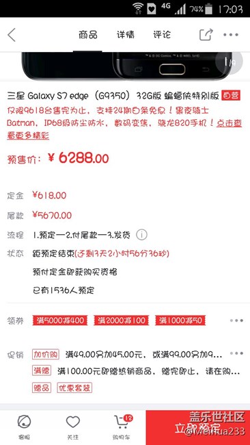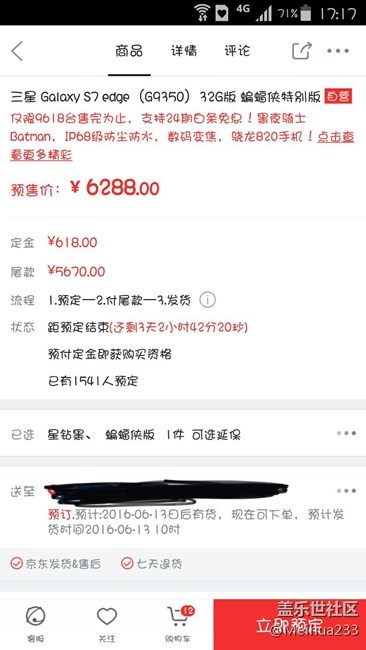 首發(fā)當(dāng)晚就下單,當(dāng)時情況是,客服端無法直接查詢“s7 edge蝙蝠俠”,所以通過間接查詢,先搜索“s7 edge”,點擊進(jìn)入選擇“s7 edge蝙蝠”,蝙蝠頁面是有促銷欄,有和普通版一樣的贈品的。但明確規(guī)定不能用券,只是下單后發(fā)現(xiàn)只有自動添加贈品/立式無線充電器/,剛才問京東客服,客服說贈品確實只有一樣/立式無線充電器/,不爽了。頁面顯示有問題我認(rèn)了,那些贈品我也不稀罕,自己有,但是!不爽。7天退貨,到就退了。我眼瞎,怪我不用電腦端咯。