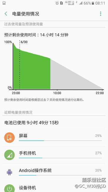 2,晚上,如果關(guān)閉移動(dòng)數(shù)據(jù),信號(hào)為2g/3g,一晚上耗電23%。
