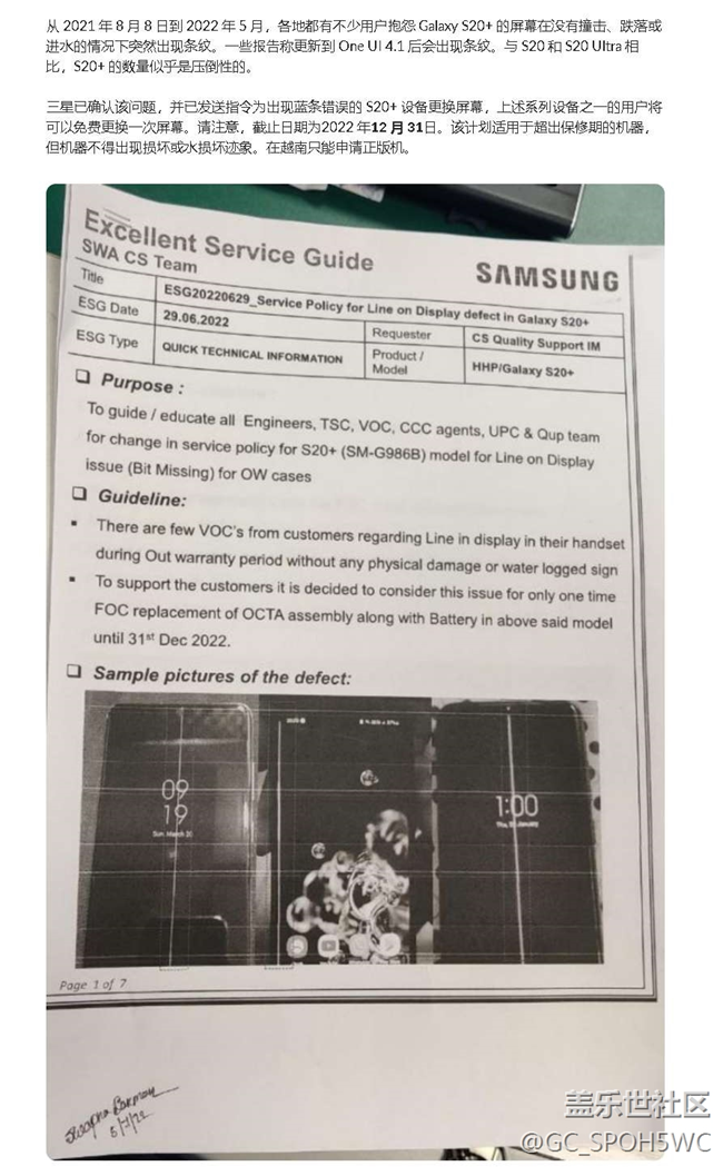 來源鏈接3(7~8):https://r2.community.samsung.com/t5/Galaxy-S/Samsung-S20-Green-Lines-on-Display-Issue-Resolved/td-p/11877330/page/2。
