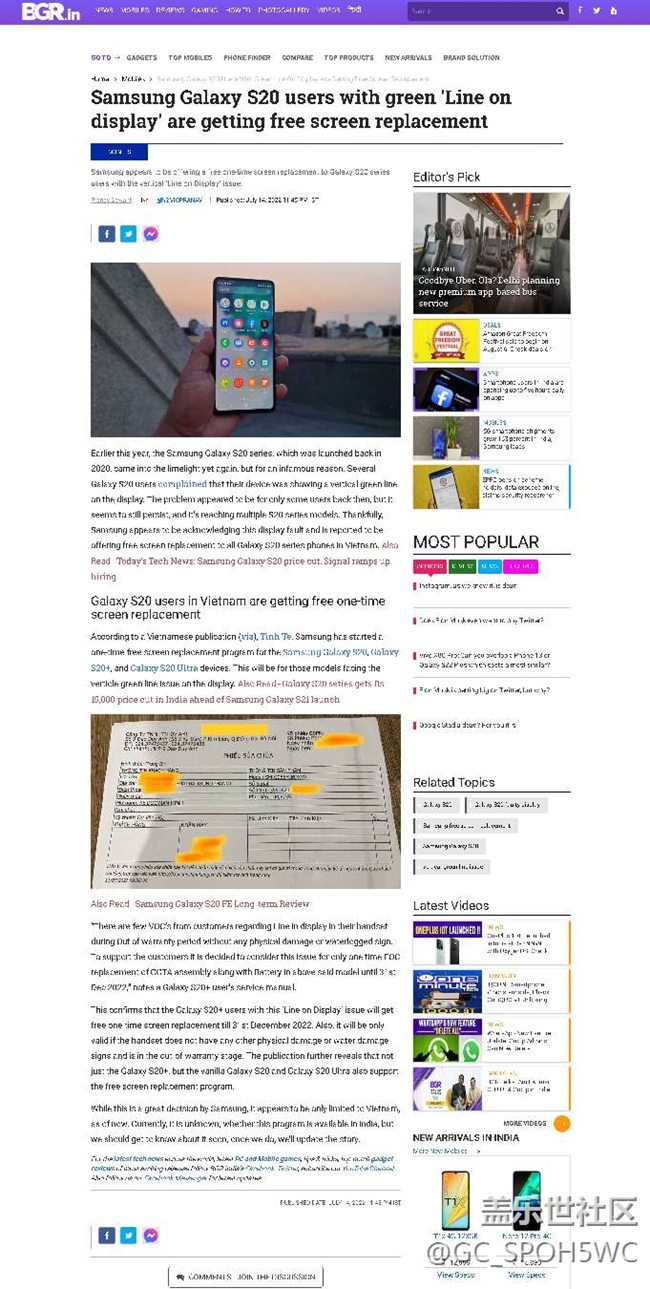 來源鏈接2(5~6):https://www.bgr.in/mobiles/samsung-galaxy-s20-users-with-green-line-on-display-are-getting-free-screen-replacement-1297385/;