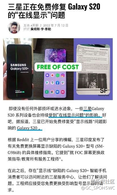其實(shí)三星早在7月初就開始給多個其他國家購買了S20的消費(fèi)者免費(fèi)處理這個屏幕質(zhì)量問題,即使是過保了也給處理,但三星現(xiàn)在非要區(qū)別對待我們這些國內(nèi)用戶,一直不愿去跟進(jìn)給出一致的公平處理,各位給三星的投訴估計(jì)也會被三星看人下菜,9折8折7折什么的,建議直接舉報和曝光。