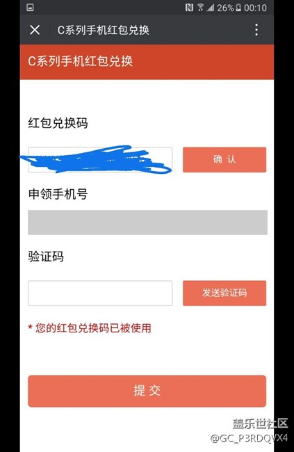 c5的100微信紅包活動(dòng)二次確認(rèn)怎么不行啊, 打上紅包兌換碼顯示兌換碼已被使用! 兌換碼就是我弟一次申請(qǐng)領(lǐng)取紅包的兌換碼,求大神指教??!