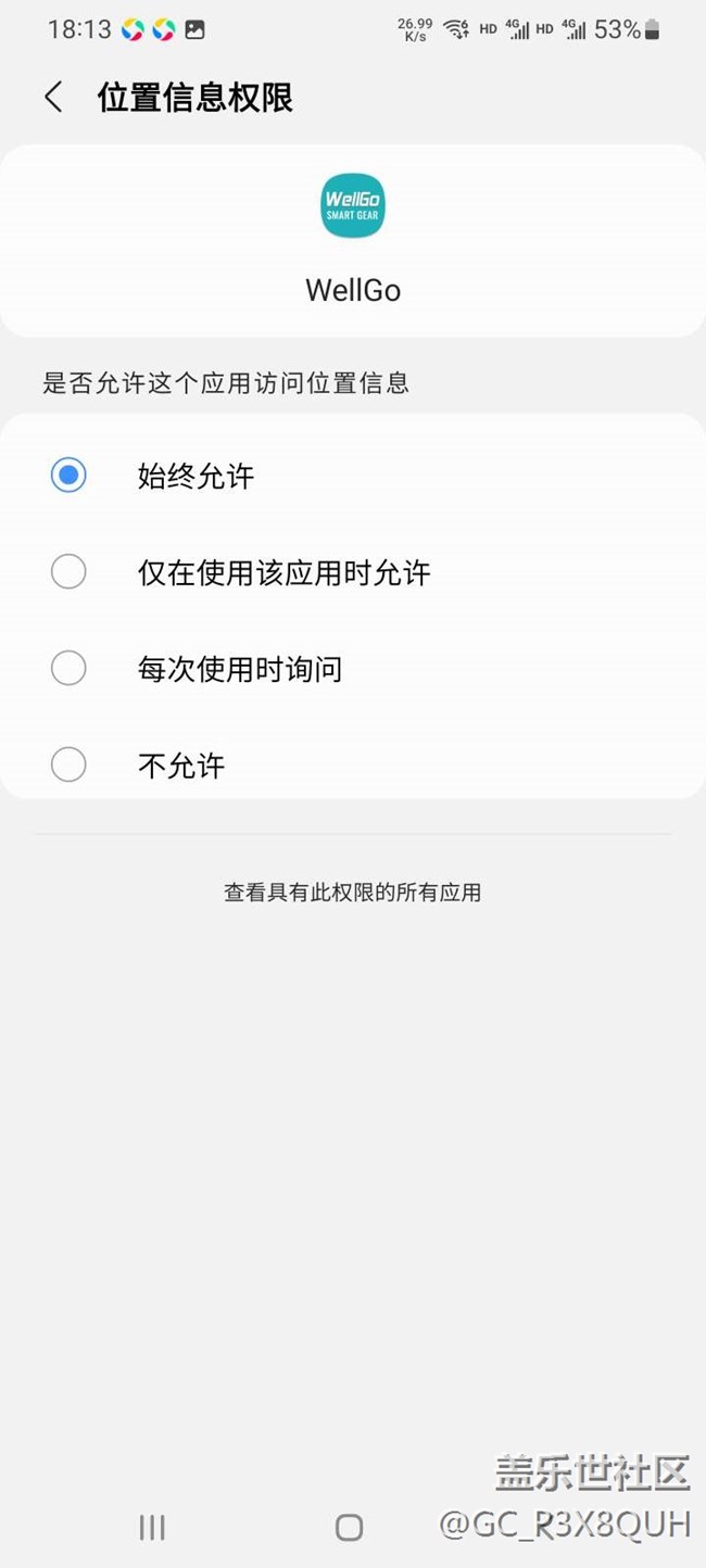 S20u安裝WellGo APP軟件打不開,安裝以后提示位置權(quán)限沒(méi)允許,但是允許以后還是提示,位置信息沒(méi)授權(quán),打不開軟件,卸載再安裝也不行,換個(gè)應(yīng)用商店重新下載安裝也不行