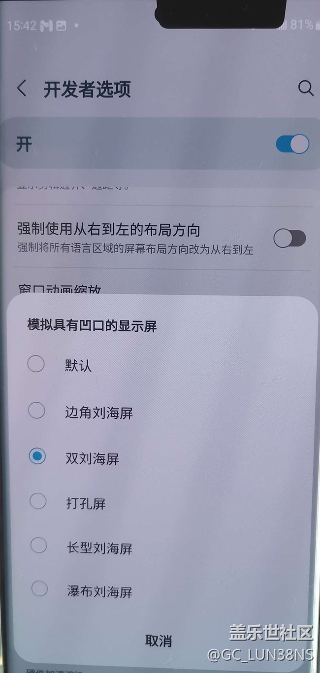 開發(fā)者選項里面的,  模擬具有凹凸顯示屏,升級了oneui5.0系統(tǒng)雙劉海屏就不居中了,手機(jī)是S22U,你們有遇到這種情況嗎