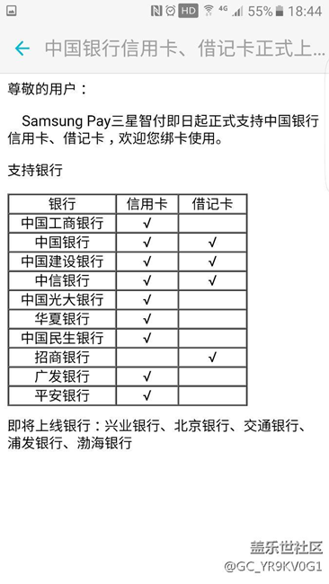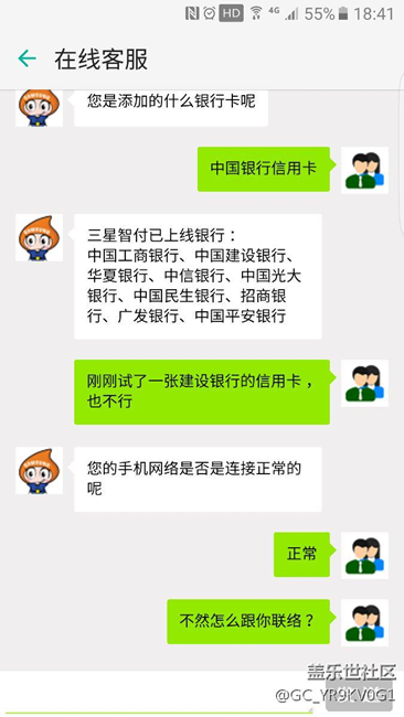 剛剛聯(lián)系三星在線客服,當(dāng)我反映添加中國銀行信用卡數(shù)據(jù)加密失敗后,對方發(fā)給我智付支持銀行范圍,里面沒有中國銀行。隨后,我馬上又試了一張建設(shè)銀行的信用卡,同樣加密失敗,對方無法自圓其說,讓我撥打客服電話。對話結(jié)束后,我查了一下智付app內(nèi)支持銀行的公告,里面第一個(gè)就是中國銀行的,我只想問,三星客服是用來解決問題的呢,還是推卸責(zé)任的?話不多說,有圖為證。