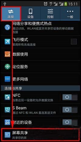 2、進入“設(shè)定”界面后,點擊“連接”菜單,找到“屏幕共享”進行自動掃描。
