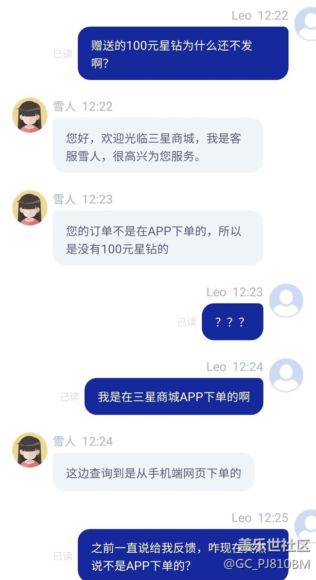 預(yù)售時(shí)在商城APP下單,說送100元星鉆,遲遲不到賬。聯(lián)系客服,一直說給我反饋。結(jié)果今天客服說后臺(tái)查詢到我不是在APP下單的,不送星鉆。我要查詢結(jié)果不給我,后面干脆強(qiáng)行結(jié)束了會(huì)話,客服就這態(tài)度?