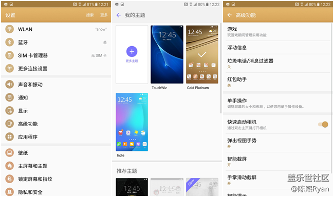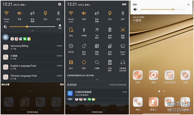 不止是設置界面,下拉菜單沒有采用慣用的“三星藍”讓筆者稍稍有些不習慣,當然依舊與Android 5.0采用了同款雙段下拉處理,如果用過三星那么相信對于這個地方的使用并不需要太多學習。