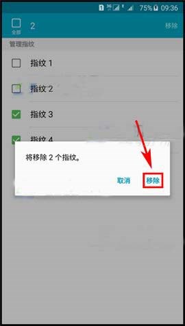 3)【勾選】需要?jiǎng)h除的指紋并點(diǎn)擊【移除】,在彈出框內(nèi)點(diǎn)擊【移除】就OK了。