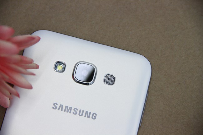 看到E7的背面,其實也是非常典型的三星式設計了,攝像頭部分突出較為厲害,閃光燈和喇叭位于攝像頭的兩側。為了保護攝像頭,E7的攝像頭周邊微微隆起,可以使得放置在桌子上的時候不至于攝像頭被磨損。