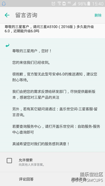 大家看看三星有沒有良心,大半年過去了,國外的A5100都升級6.0了,三星手機(jī)不管多貴,國行永遠(yuǎn)都是最后一個,其他小國家都升級了,國行永遠(yuǎn)都是墊底呢,不鬧成N4版塊那樣,三星是不會重視國行的,要是我有權(quán)利,滾回去買,別來中國欺騙中國人。