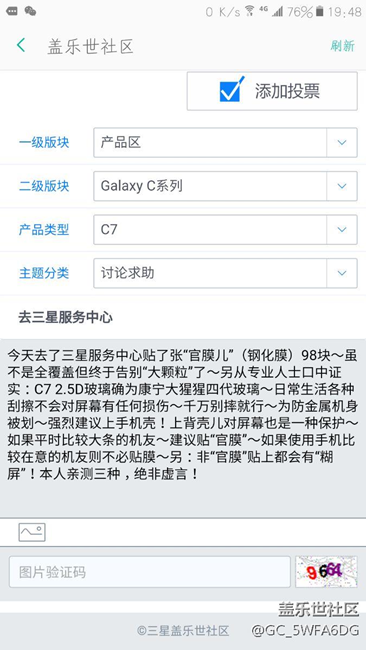 今天去了三星服務(wù)中心貼了張“官膜兒”(鋼化膜)98塊~雖不是全覆蓋但終于告別“大顆?!绷恕韽膶I(yè)人士口中證實(shí):C7 2.5D玻璃確為康寧大猩猩四代玻璃~日常生活各種刮擦不會(huì)對(duì)屏幕有任何損傷~千萬(wàn)別摔就行~為防金屬機(jī)身被劃~強(qiáng)烈建議上手機(jī)殼!上背殼兒對(duì)屏幕也是一種保護(hù)~如果平時(shí)比較大條的機(jī)友~建議貼“官膜”~如果使用手機(jī)比較在意的機(jī)友則不必貼膜~因?yàn)椤肮倌ぁ辈⒎侨采w,主屏兩側(cè)會(huì)有亮邊兒,望知悉。另:非“官膜”貼上都會(huì)有“糊屏”!本人親測(cè)三種,絕非虛言!