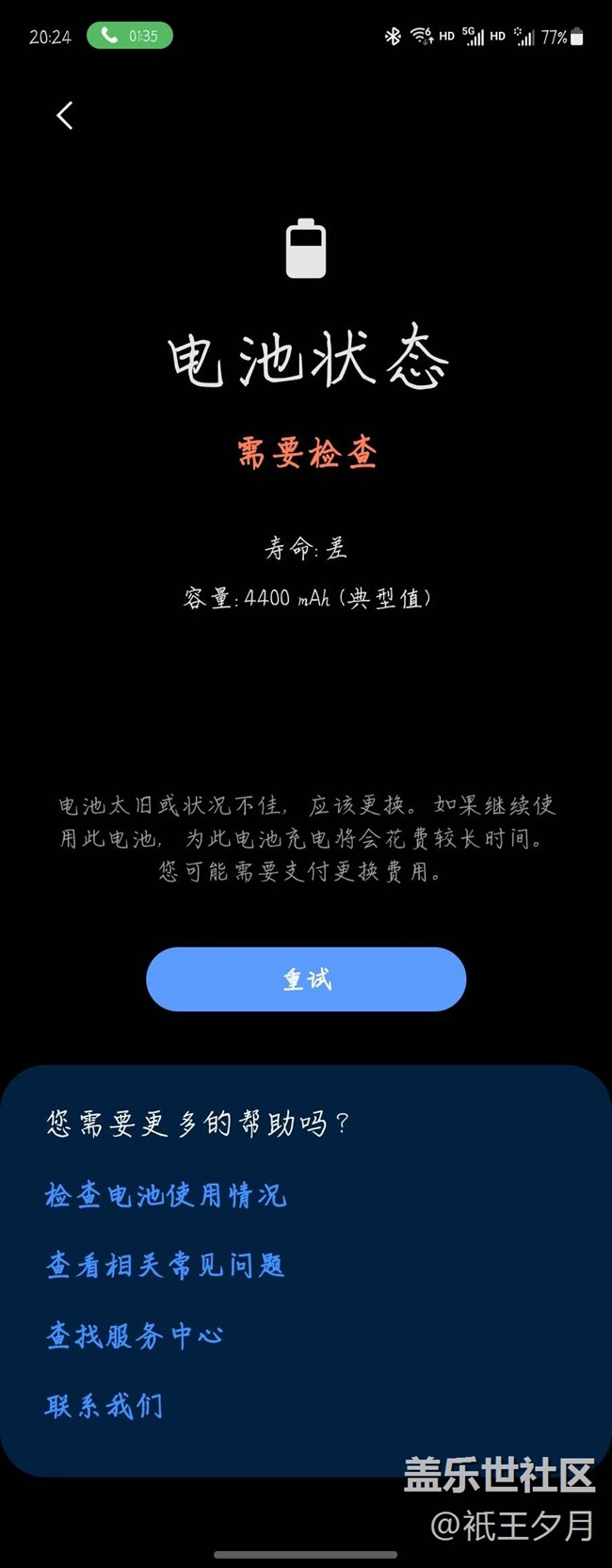我剛剛在售后更換了電池(2023年4月28日更換)。這不,今天蓋的社區(qū)診斷,檢測電池,又是電池壽命差