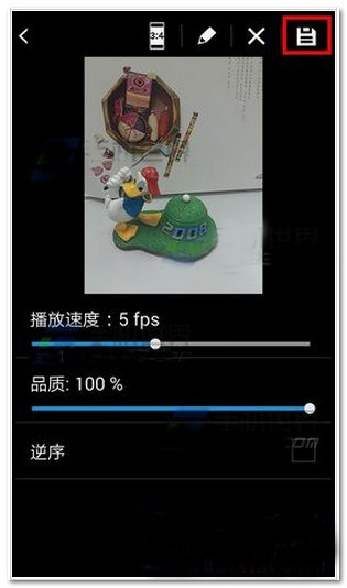 2、然后長按【快門鍵】進行拍攝,拍攝完成后,還可以對該GIF的播放速度和圖片質(zhì)量進行調(diào)整,最后點擊右上角【保存按鈕】進行保存。