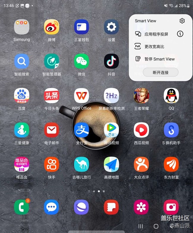 手機狀態(tài)欄下劃,找到Smart View,點擊打開,然后打開電視(現(xiàn)在的智能電視大多支持無線投屏),就能在手機上看到電視,選擇電視后點擊立即開始就可以了,讓幾十吋的電視秒變手機屏幕。