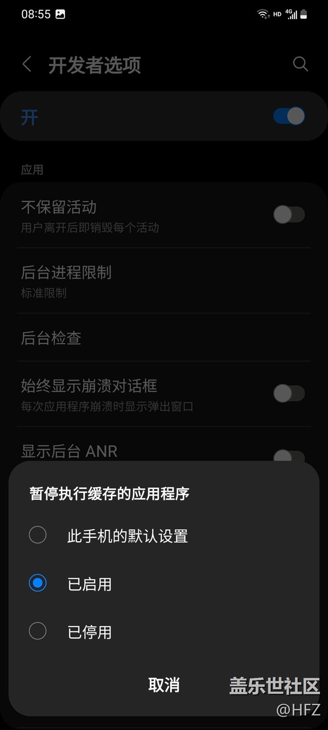 進(jìn)入開發(fā)者選項(xiàng)后菜單往下拉>>暫停執(zhí)行緩存的應(yīng)用程序