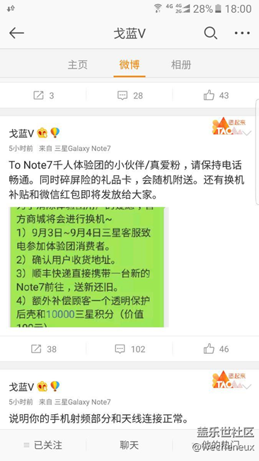 針對(duì)這兩天的note7電池風(fēng)波,接近官方的消息出來(lái)了,戈藍(lán)在微博里曬出了1000人體驗(yàn)團(tuán)的換機(jī)政策,看來(lái)我們的電池是韓版那一批次啊,不過(guò)新的換機(jī)政策我還是很滿意的,又可以有新機(jī)用了。點(diǎn)個(gè)贊!