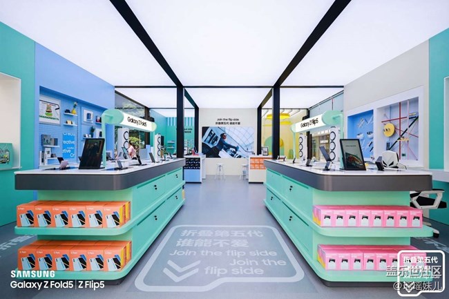 快閃店的外部裝修風格和三星門店同屬現(xiàn)代簡約黑白配色,內部則是多彩展柜,看起來更有活力