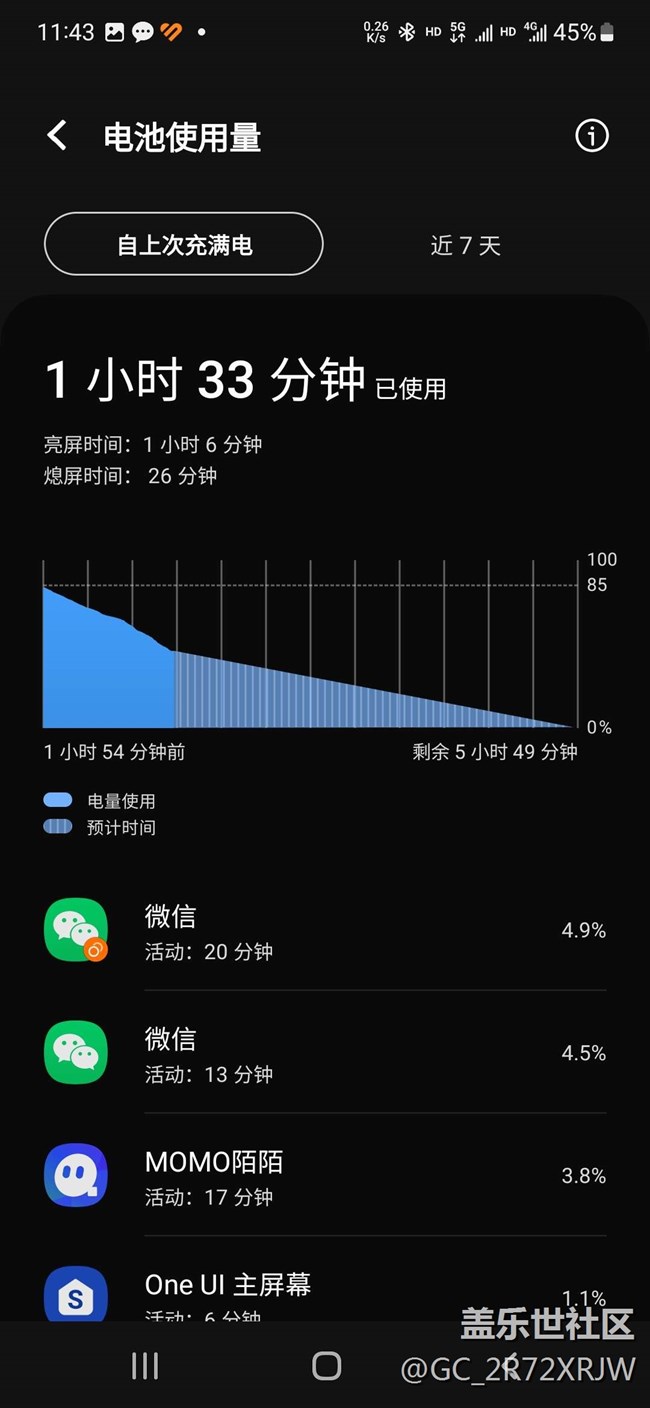 s22從85%到45%,消耗40%的電,續(xù)航兩個(gè)小時(shí),其中亮屏1.5小時(shí),排名的話估計(jì)能排到,發(fā)熱第一,續(xù)航倒數(shù)第一了吧