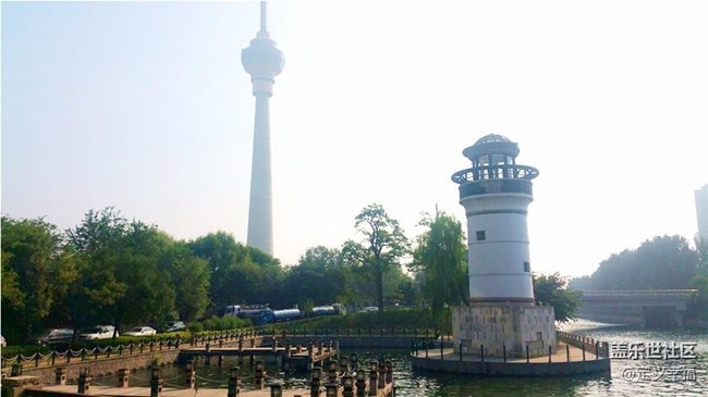 河邊的木橋和燈塔,看到了遠處的中央電視塔了。走了十分鐘感覺馬上就要到了呢,