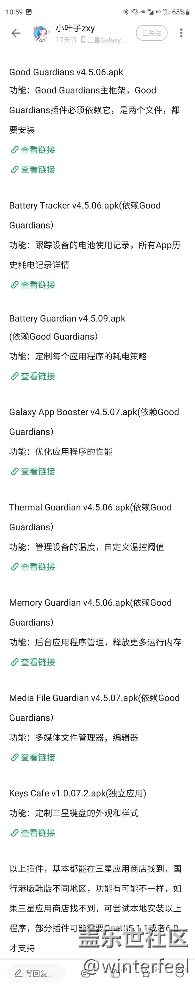 根據(jù)這個線索,去酷安找到了大神#小葉子ZXY#并關(guān)注了他,在他的主頁搜索good,內(nèi)容頁面下拉就能看到goodguardians的相關(guān)內(nèi)容鏈接,按順序復(fù)制相關(guān)鏈接在瀏覽器打開下載安裝就可以了。以上這些都是從論壇星粉朋友的帖子里找到的,總結(jié)出來,方便大家在應(yīng)用商店還沒提供goodguardians下載的時候使用交流。特別感謝#梓貽丶#、#一只小柯基#,以及酷安的大神#小葉子ZXY#。