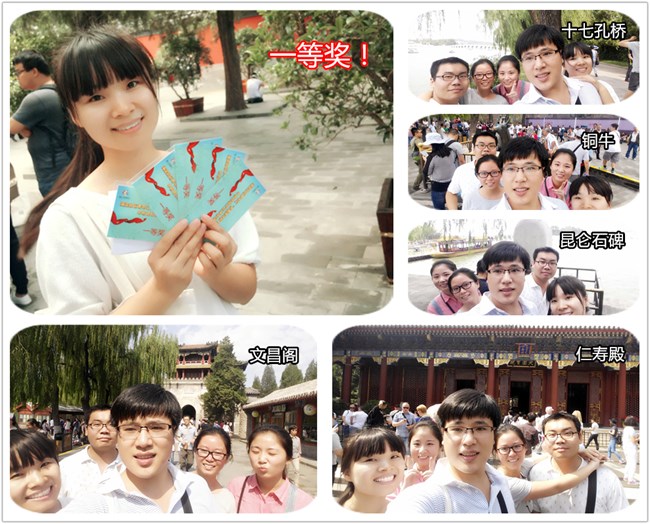 進(jìn)入頤和園后,我們就開(kāi)始向著青年匯的活動(dòng)進(jìn)發(fā)?;顒?dòng)內(nèi)容是五人一組在指定的五個(gè)景點(diǎn)合影,率先到達(dá)頤和園東門(mén)集合點(diǎn)的隊(duì)伍獲勝。我們臨時(shí)組成的五人一路小跑,在這五個(gè)景點(diǎn)合影,最終獲得了第一名,哈哈!