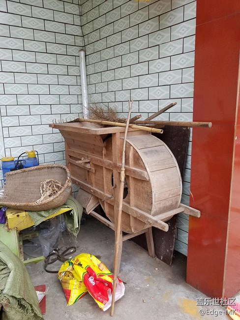 更新,我這邊叫鼓風(fēng)機。雖然很多農(nóng)家還有,但是很早以前就沒人用了。這玩意兒主要是剔除稻殼和癟谷用的。從頂上慢慢倒進去,手動轉(zhuǎn)動鼓風(fēng)機,勻速。實稱的稻谷就從圖中斜向下的槽中出來,沒有拍到的側(cè)面有一截是空的,癟谷和稻殼則被從那里吹出去。
