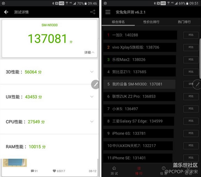 雖說(shuō)跑分不能說(shuō)明出一款手機(jī)在性能方面上的絕對(duì)水準(zhǔn),但是把它看成一款手機(jī)在性能表現(xiàn)上的一個(gè)直觀體現(xiàn)也不為過(guò)。經(jīng)筆者實(shí)測(cè),Galaxy Note7的安兔兔跑分成績(jī)?yōu)?span style="line-height: normal; font-family: 'Helvetica Neue';">137081分,相較于Galaxy S7 edge略有提升。當(dāng)然這一成績(jī)與使用者運(yùn)行安兔兔時(shí)的實(shí)際狀況也有一定的關(guān)系,我們更多的則是拿這以成績(jī)作為一個(gè)參考,實(shí)際上手的情況還需以實(shí)測(cè)為準(zhǔn)。