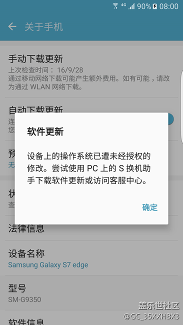 S7edge:2016年9月27號晚上檢測到系統(tǒng)更新,升級完后再點(diǎn)系統(tǒng)升級檢測提示設(shè)備上的操作系統(tǒng)已遭未經(jīng)授權(quán)的修改怎么辦?如圖: