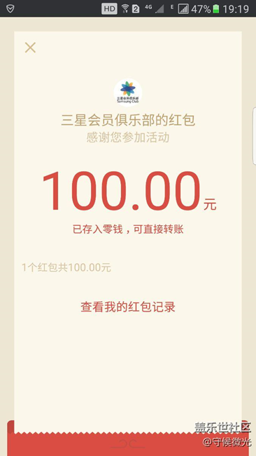 剛剛收到三星會(huì)員俱樂(lè)部發(fā)來(lái)的百元紅包,見圖